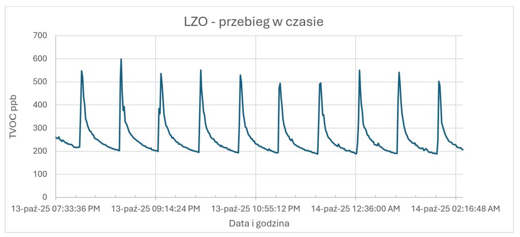 Impulsy lakieru charakteryzuje się krótkotrwałym, ale ekstremalnie wysokim stężeniem LZO (TVOC), po którym następuje kilkunastominutowy spadek do poziomów wyjściowych. Średni czas pojedynczego impulsu (od momentu wzrostu do powrotu do stanu bazowego) można oszacować na około 10–15 minut.