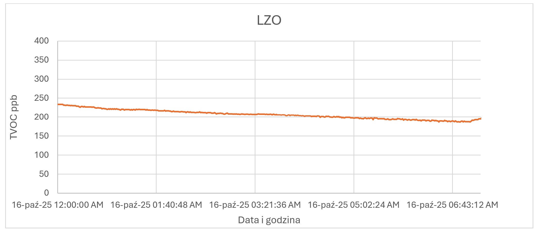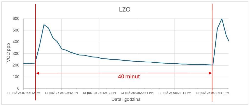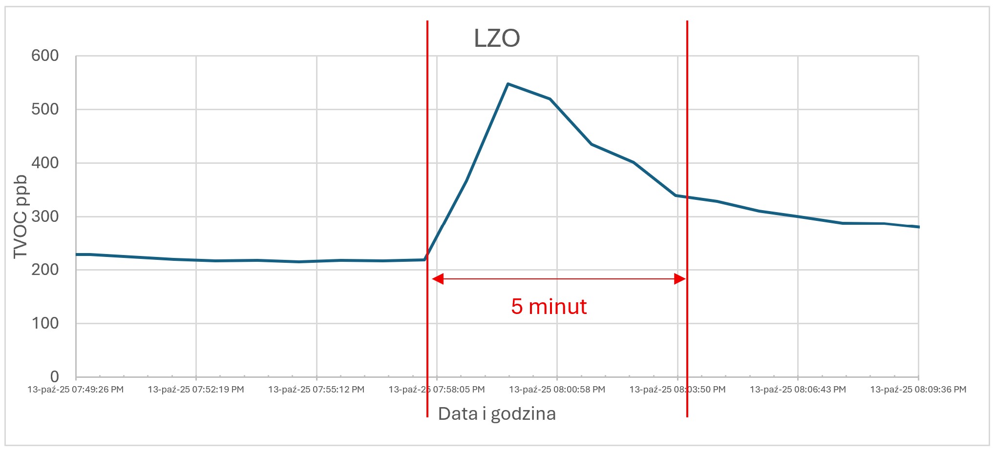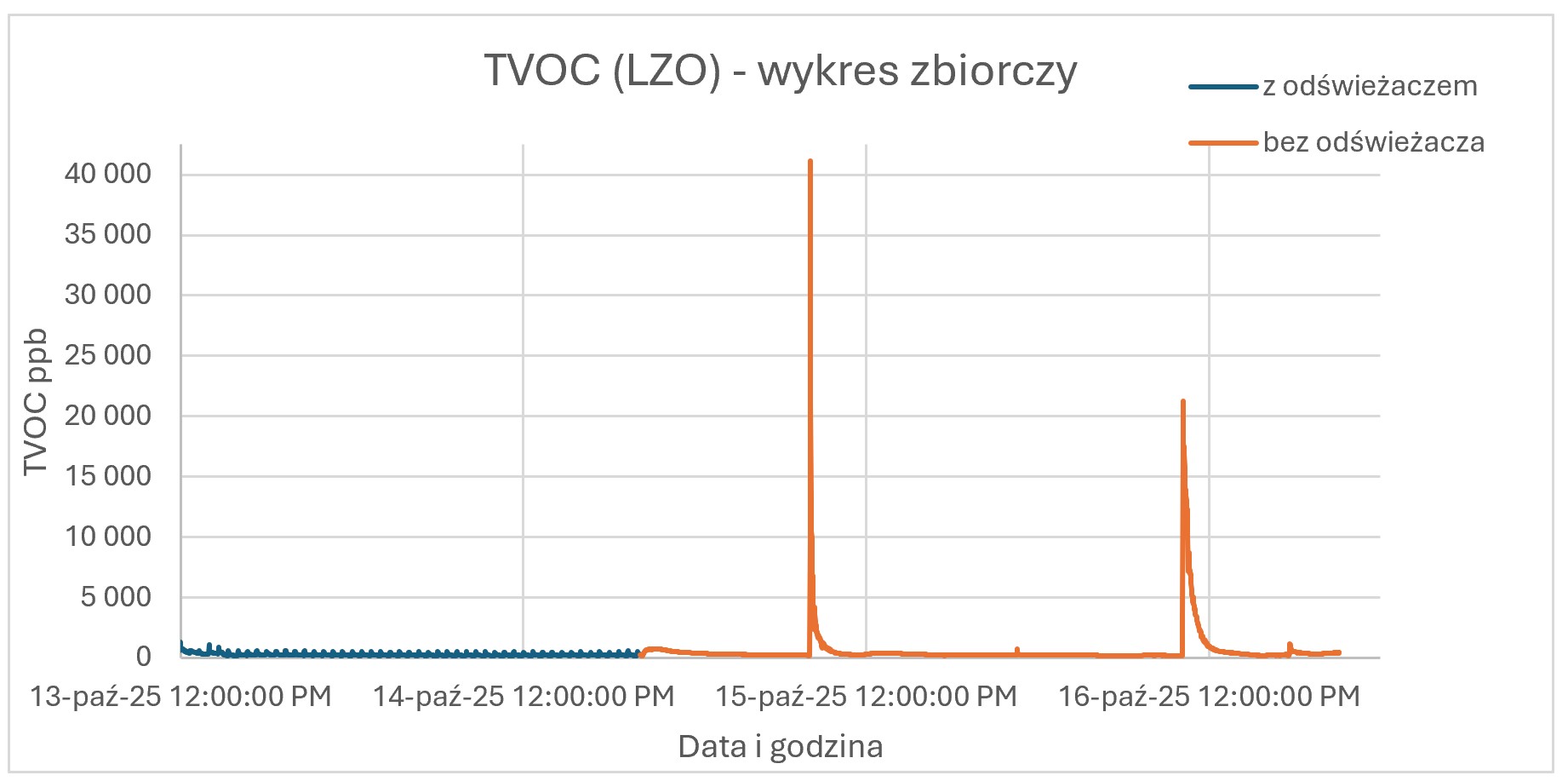 - Po usunięciu odświeżacza powietrze wykazuje stabilną i znacznie niższą emisję LZO (TVOC), bez ostrych skoków.