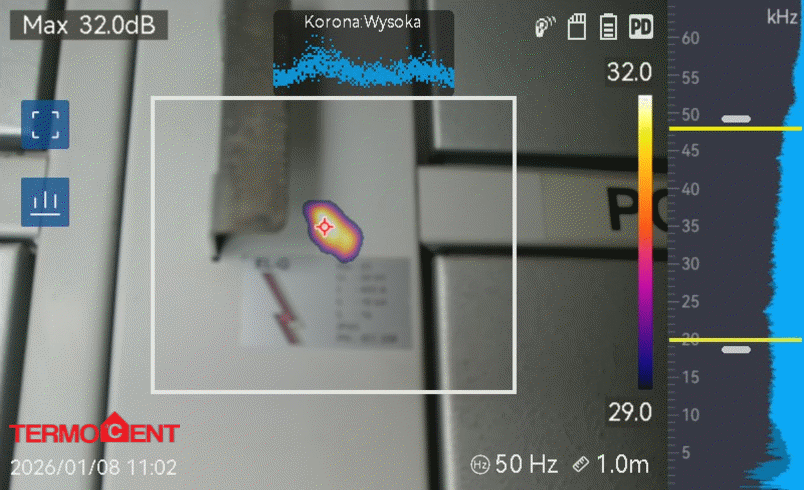 Podczas ostatnich pomiarów wykonanych kamerą akustyczną Hikmicro AI76 zarejestrowano wyładowanie niezupełne o charakterze koronowym (Corona 100%) obserwując sufit i fale odbijające się od jego powierzchni.