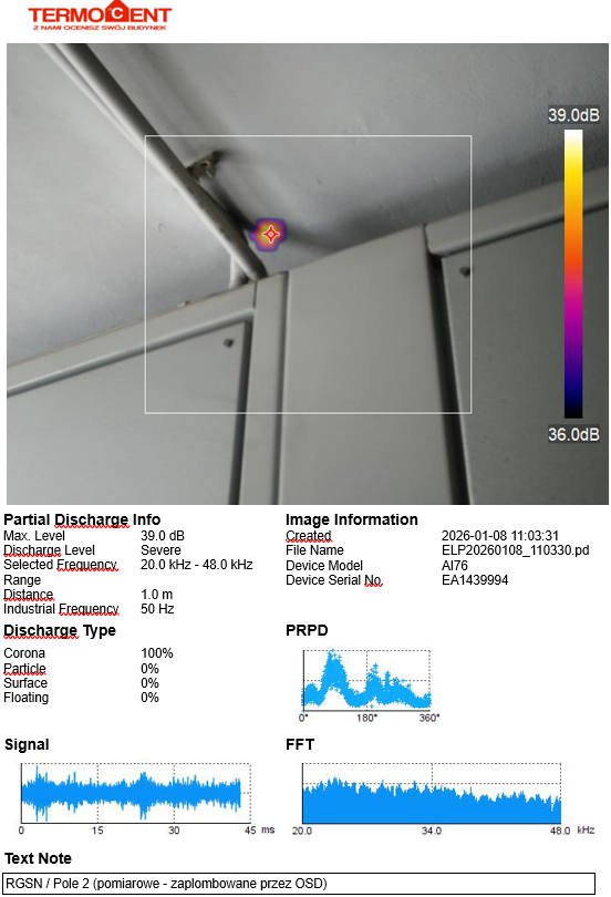 Co istotne – pomiar wykonano bez ingerencji w instalację (element zaplombowany przez OSD). Diagnostyka była całkowicie bezinwazyjna. Badanie wykonano na falach odbitych od sufitu nad wadliwym urządzeniem.